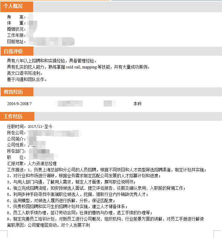 500强外资集团公司 人事主管岗 推荐成功