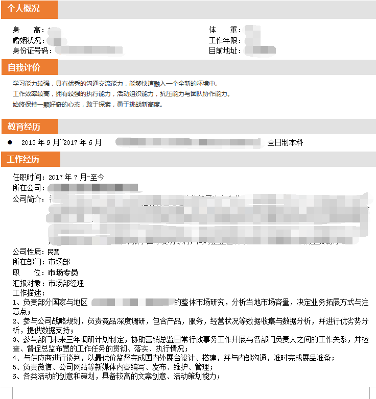 加入本司会员后 成功推荐至 知名外资咨询公司 市场专员的职位