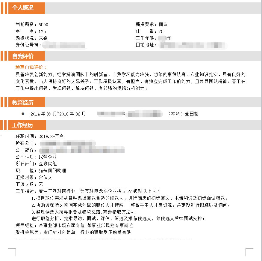 18年应届全日制本科男生 未婚 毕业于安徽一本院校 工作时长6个月