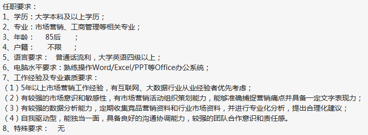 知名上海百强集团公司,上海静安区上班,急招市场总监(大数据方向),薪资15-25k,5年以上市场工作经验,有互联网、大数据行业从业经验者优先考虑、85后