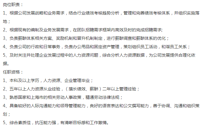 国企融资租赁公司要人事经理,年薪20-30万一年,有5年以上相关经验,本科学历,抗压能力强,浦东2号线世纪大道办公