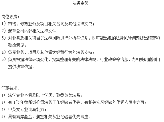 知名投资机构,上海静安寺上班,急需一名法务专员,年薪税前12~30万,具体看个人能力和背景。要求是本科在境外就读英美法(最好是港大、港中文、新加坡国立或者美国排名靠前的学校),有过1年左右英美法相关工作或实习的经验。