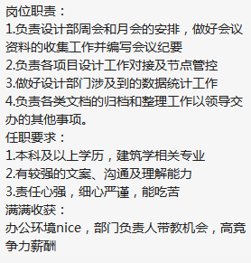 中国地产三十强招设计运营啦 要求全本以上学历,建筑相关专业,接受优秀应届毕业生,薪资open可谈,看人定薪。每月额外补贴1000,每年额外过节费税后3800,年底双薪,福利多多。坐标10号线紫藤路