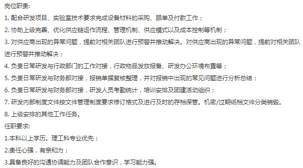IPO上市高新技术企业招聘管培生两名,要求全本以上学历,一名化工专业作为储备干部培养~ 一名不限制专业作为部门助理多线发展,薪资base7-10k,每月额外话补加免费食堂午餐,年底1-3个月bonus。上班时间弹性不打卡周末双休,坐标莘庄工业园有班车直达。