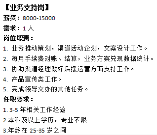 复星旗下子公司招业务支持啦,要求至少两年以上相关经验,做过销售行政、销售运营、部门助理等岗位背景佳,全本以上学历,8-15k,年底14薪,早9:00晚5:30周末双休,坐标6号线临沂新村