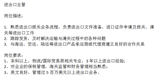 新加坡上市公司要进出口主管,薪资15-18k,英语好,需要熟悉海关法务,保税仓库,手册等。4号线浦东大道上班。包午餐,年底15-18薪。
