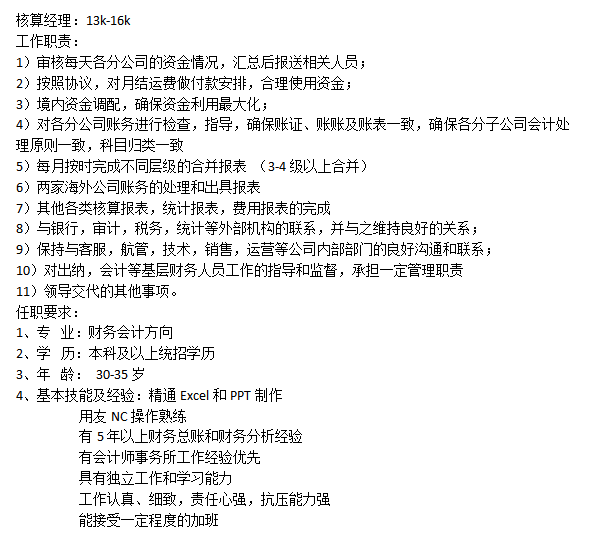 业内知名的航运互联网平台,先后获得红杉资本等6轮融资,需要:核算经理:有总账经验,会做报表,最好熟悉用友,NC系统,13-16k,9号线芳甸路