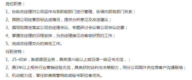 电子半导体公司要总助,要求有2年左右相关经验,本科学历,25-40岁,女士优先,薪资8-10K,朝九晚六双休,上班地点:嘉定 11号线马陆