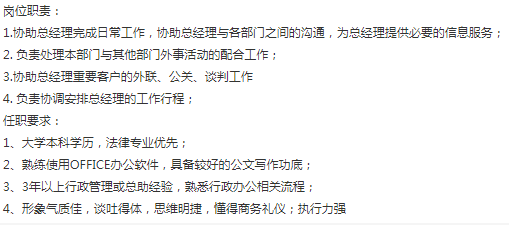 上海百强集团公司,总部急招一个总经理助理,偏对内,有一定法务文笔功底,应届生可看(法律专业优先),男女不限,英语书面熟悉即可,薪资8-13k +bonus,2号线中山公园上班