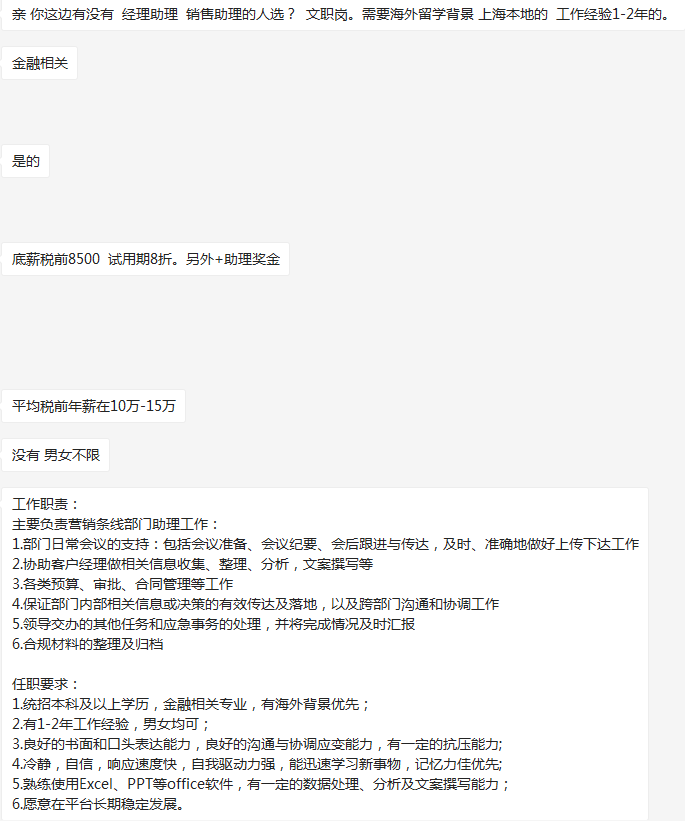 金融公司要经理助理,需要海外留学背景,上海本地的,工作经验1-2年的。男女不限,底薪税前8500,试用期8折,另外+助理奖金,2号线静安寺办公
