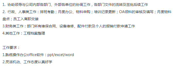 港资地产公司招工程助理1名,做五休二,9-18点,工作稳定,要求:女生已婚已育,有物业相关经验,薪资:6k,补贴:400,坐标:四川北路天潼路(地铁10/12号线天潼路站),欢迎推荐或自荐