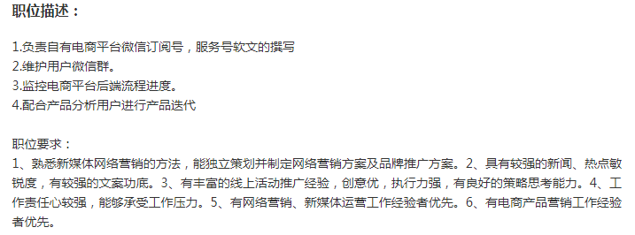 有没有一年以上经验的新媒体运营~偏微信公众号运营文案,电商背景佳,业内知名上市网络营销公司要人啦,base区间8-12k,年底13薪,每月额外补贴。坐标4号线大连路