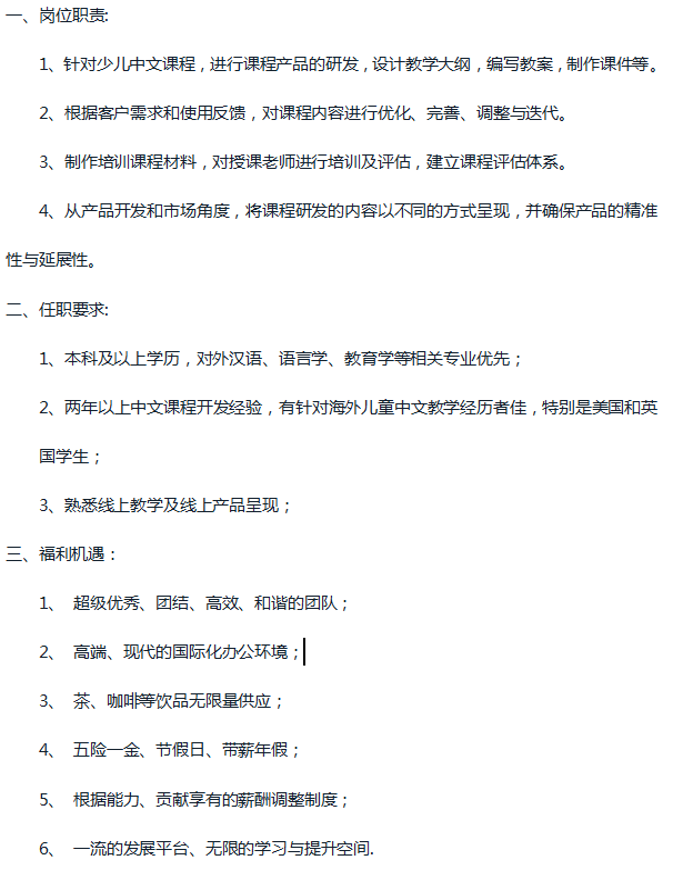 硬性要求: 要有对外汉语经验,必须要有教学的经验