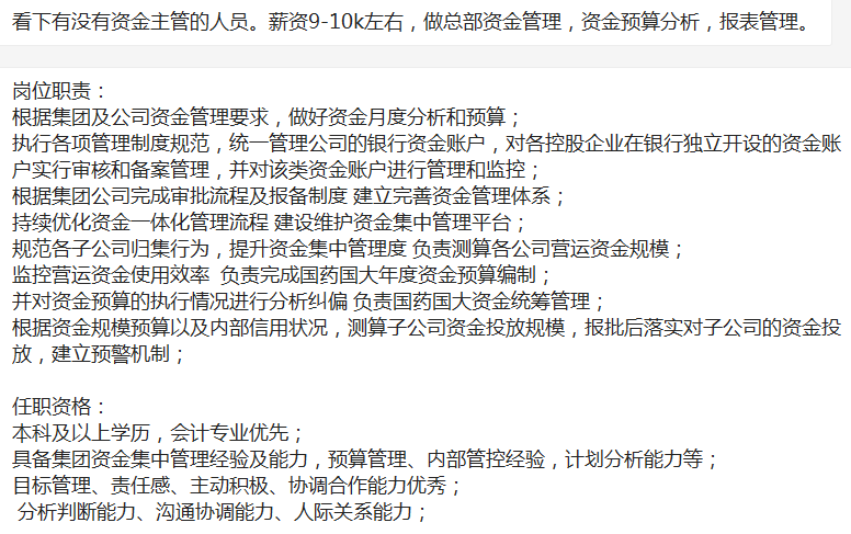 国药系公司要资金主管,薪资10k左右+五险一金全额,节日费,全年14薪,补贴每个月都有,这个要看职级的,南京东路上班