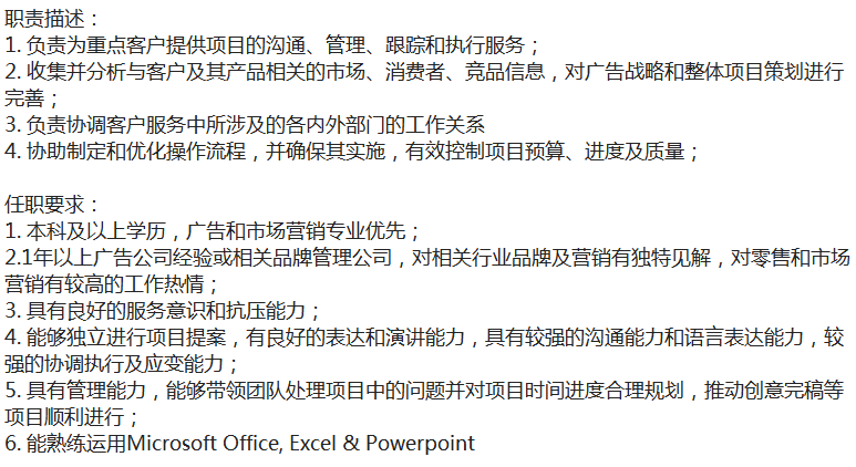 有没有广告、乙方市场公司出来的项目主管要找工作的,薪资10-15k。只要男性,全本以上学历。12号线曲阜路上班