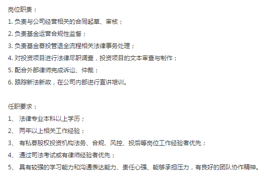 沪上知名投资公司,要法务风控,具体要求看JD,薪资10-20K,上班地点:陆家嘴