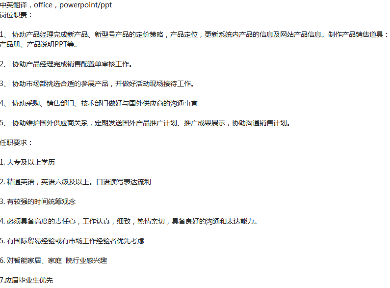 有没有英文好的男生?做产品专员,经验不限,薪资6-8k,全额交金,2号线淞虹路上班
