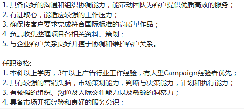 国内知名上市营销科技集团公司,招客户经理,广告行业背景优先,汽车行业背景优先,有大型Campaign经验者优先,擅长线上平台的营销策划,薪资10-15k+全额交金+年底14-15薪,上班地点:8号线虹口足球场