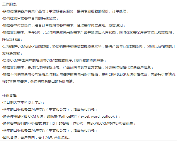 外企(仪器/电气/自动化) ,招聘客服协调专员,要求英文书面好一点,熟练使用ERP和 CRM系统,熟练操作office软件(excel, word, outlook),薪资7-9k,15薪,五险一金+补充医疗,年假12天起,弹性一个半小时,8:00-9:30,双休,上班地点:10号线江湾体育场