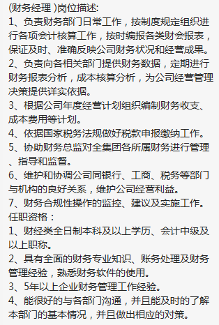 要求:全本学历,有中级职称,五年以上财务管理经验,不要频繁跳槽。基本薪资15-20k+全额交金+饭贴20元/天+年底bonu,朝九晚六,双休。地址:近9号线宜山路