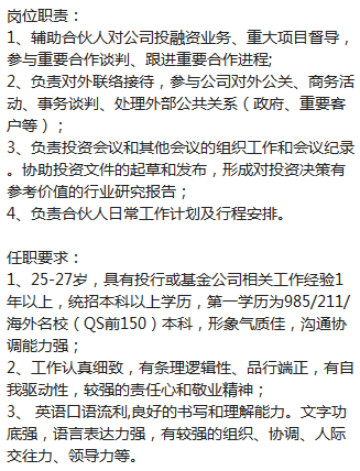 资产管理公司要一个合伙人助理,要求名校毕业的具有投行或者基金公司相关工作的,女生,形象气质佳,年龄最好在25-27岁,英语流利,薪资10-20k,2号线,金科路上班