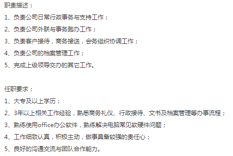 备注【本科以上学历,希望有点行政工作经验,可塑性强,工作内容偏文书、档案和商务接待】