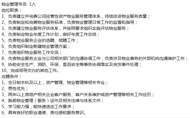 国企房地产公司,要物业管理专员,全本学历以上,薪资8-10k+车贴1200/月+通信200+年终奖金+工会福利等,上下班时间朝九晚五,2号线金科路附近上班