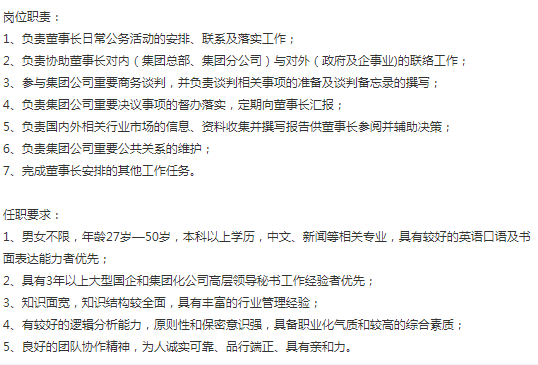 大型集团公司,要招一个董事长秘书,薪资15-20k,包三餐,如果有要求可以提供住宿,对内对外都有,有商务谈判,政府接待相关经验,有一定英语基础(4/6级就行用的不多)35-45岁, 能接受出差,介意勿投