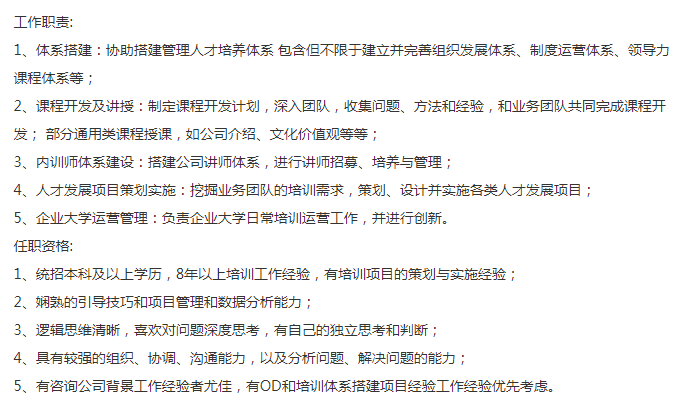 国内知名通信科技集团公司,招培训专家,男士,4年以上经验,涉及业务培训、领导力培训、管培生培养、人才培养等,薪资18-25k+补充医疗险+年终奖,上班地点:12号线虹漕路