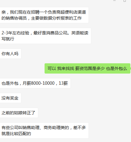 欧美外资要销售协调员(销售助理),2-3年左右经验,最好是消费品公司。英语能读写就行,主要做数据分析报表的工作,月薪8000-10000,13薪,外包合同,介意勿报,上班地点:1号线黄陂南路