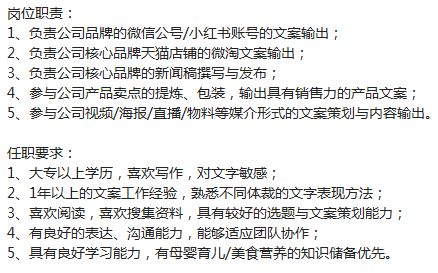 母婴行业,要个文案,应届生也接受,有相关文案作品就可以,薪资6-8k+绩效+餐补+交通补,年底13薪,8号线鞍山新村附近上班