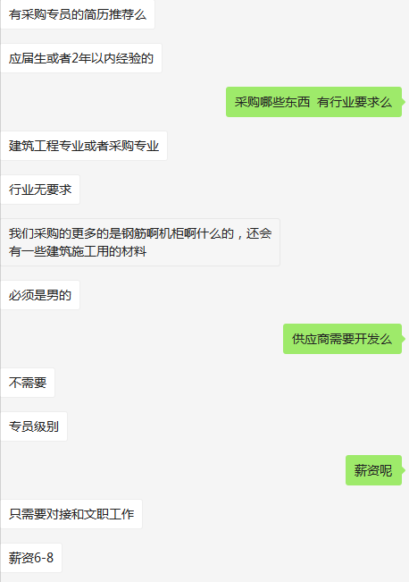 急招岗位:集团公司要采购专员,男生,应届生,或者2年以内工作经验,建筑工程专业或者采购专业,薪资6-8k,年底13-14薪, 包两餐,早9点,晚5点半,双休,2号线南京西路上班