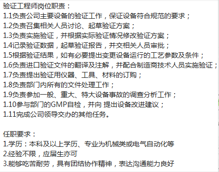 国内知名医药公司急招验证工程师,薪资8-12k.,必须有医药经验。额外交通补,有食堂。上班时间8.30-5点,很少加班。年终13-14薪。闵行附近上班