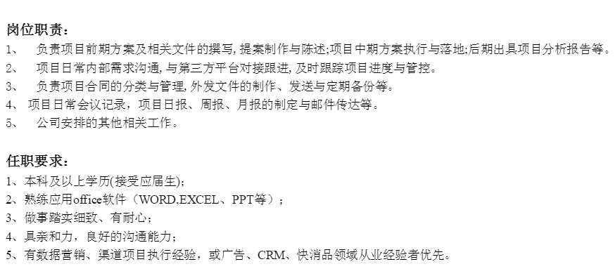 乙方市场策划公司要项目助理。男女不限定,应届生就行,6k+绩效奖金+13薪,南京西路上班,急招岗位,这两天就能面试。