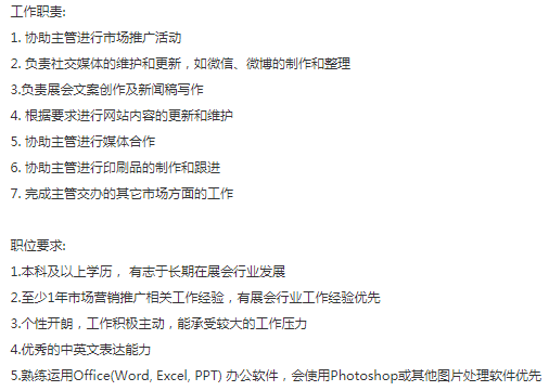 世界十大国际专业展览公司之一 ,要个项目专员,工作整体偏线上,展会行业优先考虑,英文稍微好些,本科以上学历,1-2年经验,薪资7-8k +年度体检+商业医疗保险+五险一金全额+年终奖,2号线陆家嘴上班
