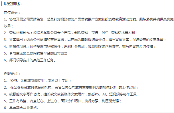 国内知名基金公司,要营销策划经理/专员,本科以上, 1-3年金融公关背景经验,会策划有较强的文字功底,薪资面议+补充的公积金和商业险+餐补通讯补+其他,工作地址:2号线龙阳路