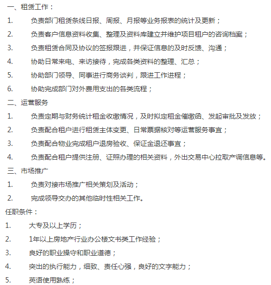 香港联交所上市地产公司要租赁策划专员,1年以上房地产行业办公楼文书类工作经验,英语好加分,薪资8-12K,补贴:400 9-17:30,双休,坐标:四川北路天潼路(地铁10/12号线天潼路站)