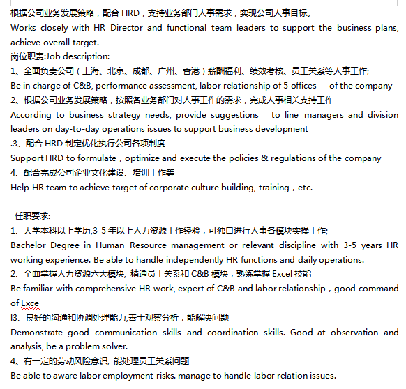 法资广告公司要个人事主管,英文能日常沟通,最好全模块专业能力强的,预算12-15k,全额交金,补充医疗,11号线交通大学