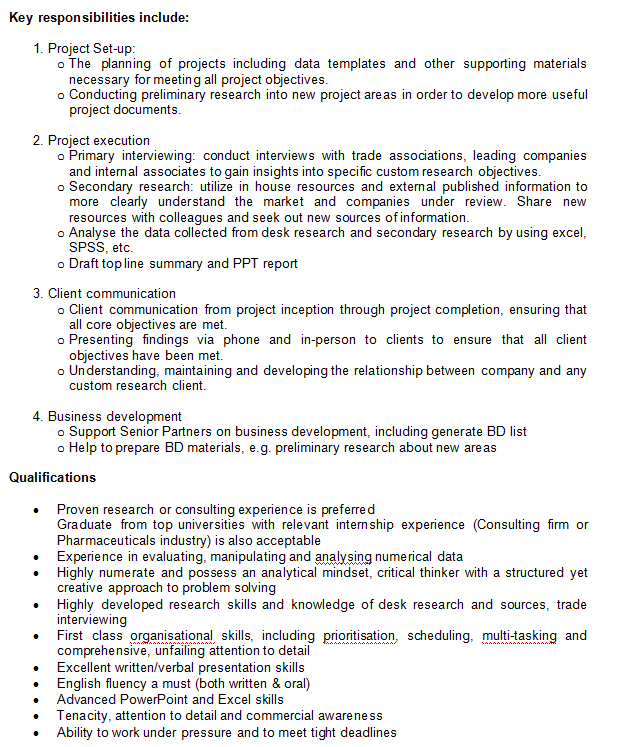 咨询公司招行业分析师,有研究或咨询经验者优先,有相关实习经验的顶尖大学毕业生(咨询公司或制药行业)也可以,英语流利,全本及以上学历背景,薪资8-10k,年中国内游,年终国外游,弹性工作时间,可协助落户,2号线静安寺上班