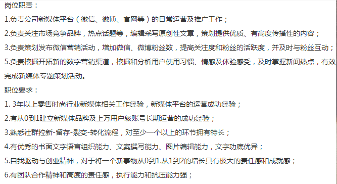 零售行业上市集团公司全资子公司要新媒体运营主管,12-15k, 补充商业险13薪,10天年假。要求最好零售时尚快消行业的背景。 2号线江苏路办公