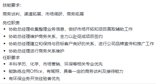知名环境科技公司,招商务助理,本科学历,化学、市场营销、环保等相关专业优先,男生,沟通能力好,具备一定的商务谈判及接待能力,优秀应届生可报名,薪资6-10k,上班地点:12号线虹梅路