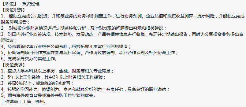IPO上市公司,招投资经理,要求重点本科及以上学历,薪资:面议,五险一金全额缴纳,上班时间:8:30-17:30,周末双休,办公地点:9号线松江新城地铁站附近