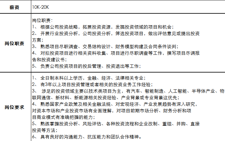 备注【最好做过4~5个项目,有汽车、智能制造、人工智能、半导体产业、物联网通信、新材料、新能源相关投资经验】