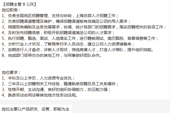 知名在线教育龙头企业,要个招聘主管,本科学历,薪资8-12k,招聘岗位主要以产品研发、运营、职能为主,8/12曲阜路上班