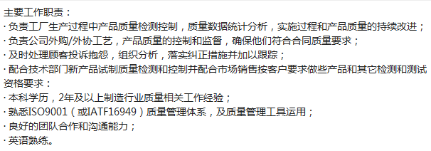 百年历史外资企业(制造行业),要英文好的质量工程师,要求有制造行业质量工程师经验,薪资10K*13薪+奖金,五险一金全额缴纳,办公地点:11号线御桥地铁站附近