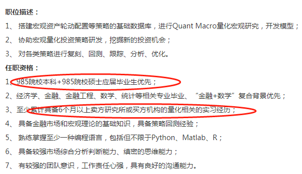 投资管理公司要宏观量化研究院,学历最好是一流大学,一定要有宏观量化的经验,薪资10-15k,上班地点:陆家嘴