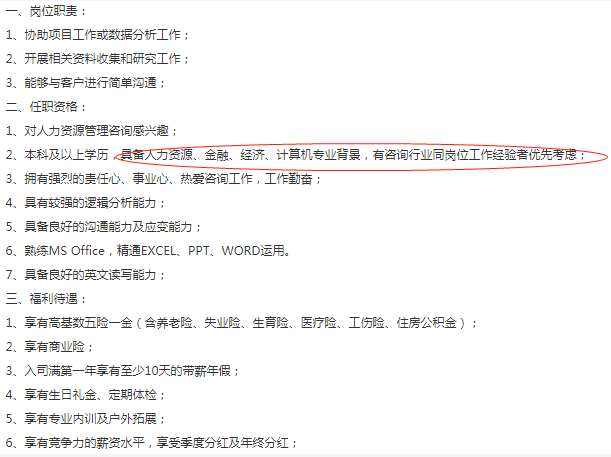 咨询公司招聘咨询顾问助理(人力资源方向),男女不限,学历必须是985、211,或者qs前50,公司员工也都是国内国外一流大学毕业,薪资15-25k,有咨询行业同岗位工作经验者优先考虑,上班时间:9:30-6:30,双休,可以协助落户,满一年有10天年假 以此类推,20天封顶,五险一金+补充商业,上班地点:13号线 江宁路