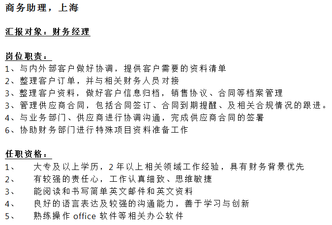 知名跨国咨询公司,上海黄浦区上班,急招商务助理,主要是做客户订单管理,还有供应商合同管理的。偏财务,2年左右经验,薪资8k左右,特别好人薪资可谈,英文能简单看和写邮件大专学历及以上