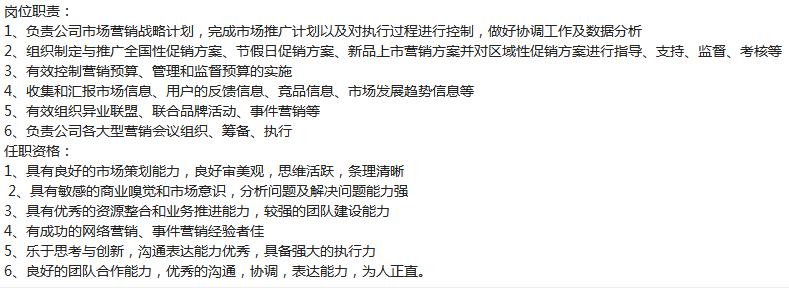 知名家居科技公司,招企划经理,3-4年经验,家居行业或者酒店行业背景优先,优秀的营销策划管理能力,薪资15-20k+五险一金全额缴纳,车饭贴35/天,年底13薪起,上班地点:1号线上海体育馆,JD如下: