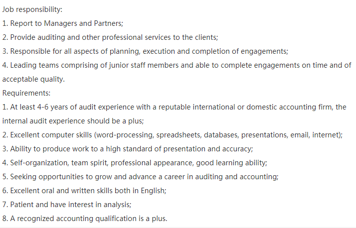 知名外资财务咨询公司,招高级审计,事务所背景优先,英语可以作为工作语言,薪资15-20k+补充医疗+年终奖金,上班地点:二号线静安寺